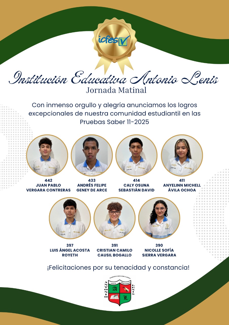 La Institución Educativa Antonio Lenis se enorgullece en felicitar a todos nuestros estudiantes que obtuvieron excelentes resultados en las Pruebas Saber 11 (ICFES). Estos logros son el reflejo del esfuerzo, la disciplina y el compromiso que cada uno de ustedes…