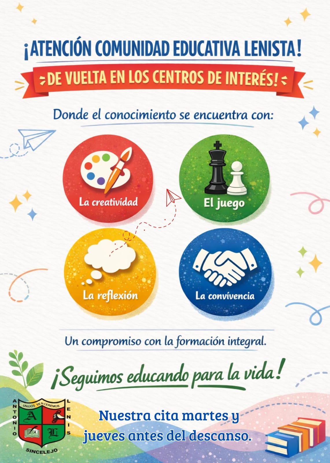 Querida comunidad Lenista, nos emociona anunciar que estamos de vuelta con los Centros de Interés, espacios diseñados para fortalecer la formación integral de nuestros estudiantes. A través de la creatividad, el juego, la reflexión y la convivencia, seguimos educando para la vida.